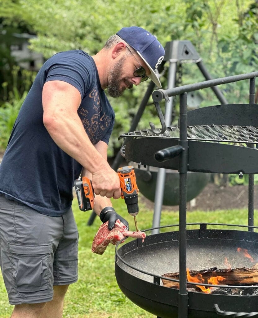 Chris also cooks a lot over live fire—hanging Dutch ovens, searing steaks on grates suspended over embers, even slow-smoking meat outdoors.