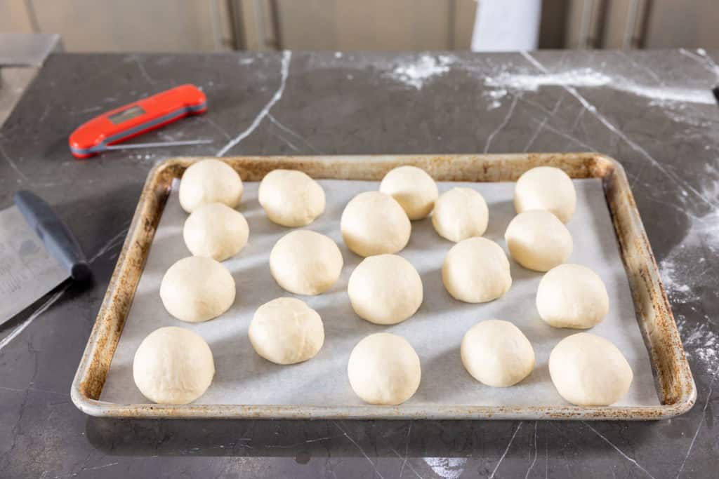 - Roll each piece on the countertop to form a ball. Put them all on a sheet tray and set them aside to rest for 20 minutes. Cover them with a cloth to prevent drying out.