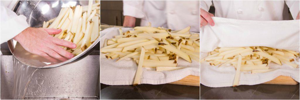 When I want french fries—expecially homemade ones—I want them golden and beautiful. That’s why the rinsing step is important. We know potatoes are full of starch (we’ll talk about how to deal with that in a minute), but they are also full of natural sugars. Starches are, in fact, composed of chains of simple sugars. As we cut the potatoes into sticks, we release some of those sugars onto the surfaces of the potato strips. If we were to fry them without first rinsing them, the sugars on the outside would caramelize in the hot oil and burn before the interior starches have had a chance to cook properly, which can result in brown, acrid-tasting and unattractive french fries.