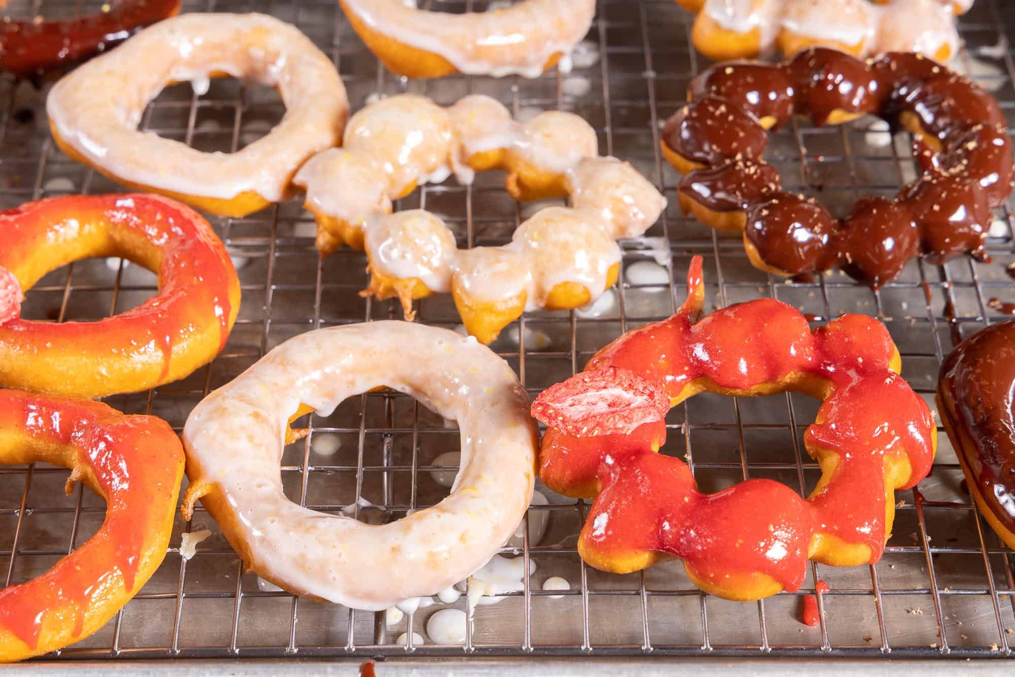 These donuts are beautiful, especially if you go through the trouble of piping them into the bubble-ring shape. But they get even prettier when you glaze them. You can use any glaze recipe you like, or any topping for that matter. We made a simple glaze of powdered sugar, a little lemon zest, and some milk; but we also made one with pulverized freeze-dried strawberries. When the strawberry powder hits the milk, it rehydrates, giving you a jammy texture for your glaze that is super fun. We also made a simple ganache with equal parts chocolate and cream with a little corn syrup for shine. But you can follow your dreams with the toppings! People love to make a glaze with matcha, and some add sesame seeds. Be creative, and have fun. Or just top them in cinnamon sugar while they’re still hot. It’s hard to go wrong!