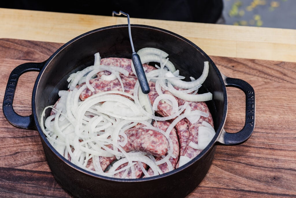 While people will boil the brats for a long time, it isn’t necessary to do so. Once the proteins cook, they don’t admit any beer into them. So no more beer will get in there. And the longer you boil them, the less snappy your casing will be—it will start to soften and almost dissolve. So cooking them just to the point where they are safe to eat and fully cooked gets you brats that are ready sooner with no degradation in quality. Cook to temp, not to time.