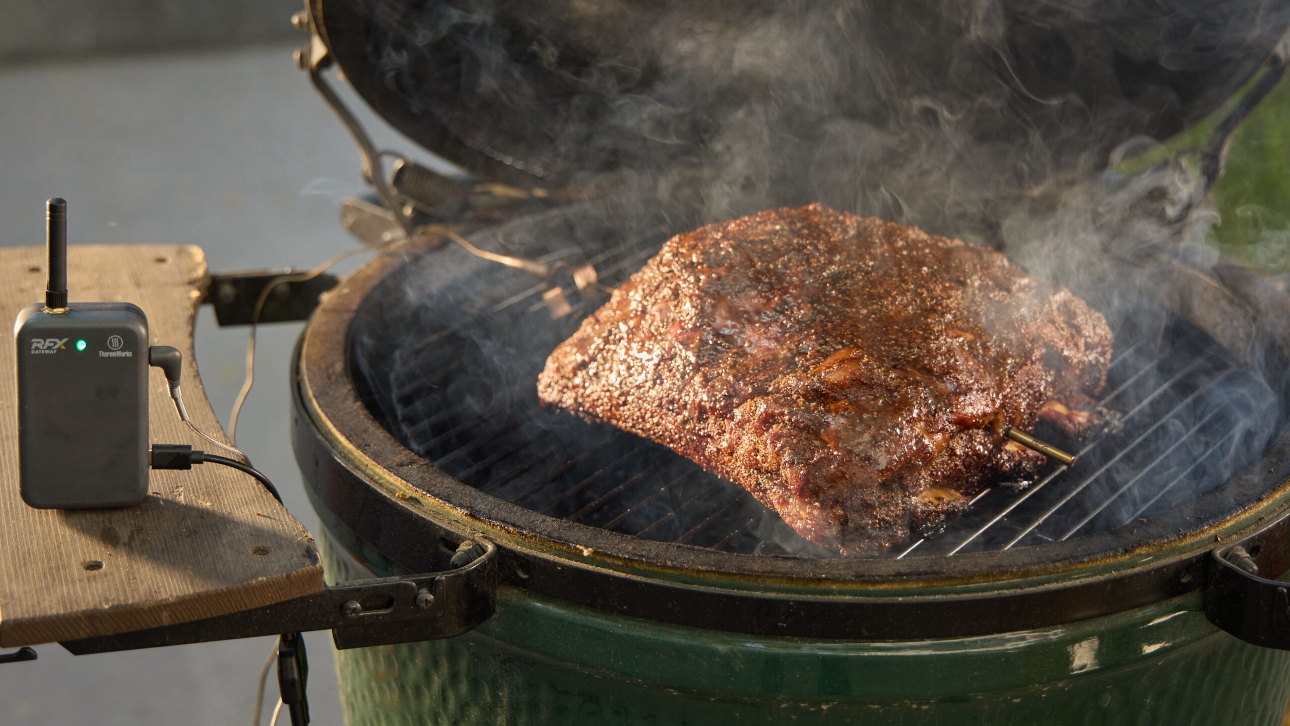 We chose to use a kamado-style smoker for this cook. But no matter what smoker you use, make sure it’s heated to 225°F (107°C). We set ours up using our Billows® barbecue control fan, and monitored the air temp using the air probe from our RFX GATEWAY™. We also threw a chunk of cherry wood on the coals a few minutes before we put our meat in, to smoke—for extra flavor and color. We continued to use Billows throughout the cook to maintain our pit temp.