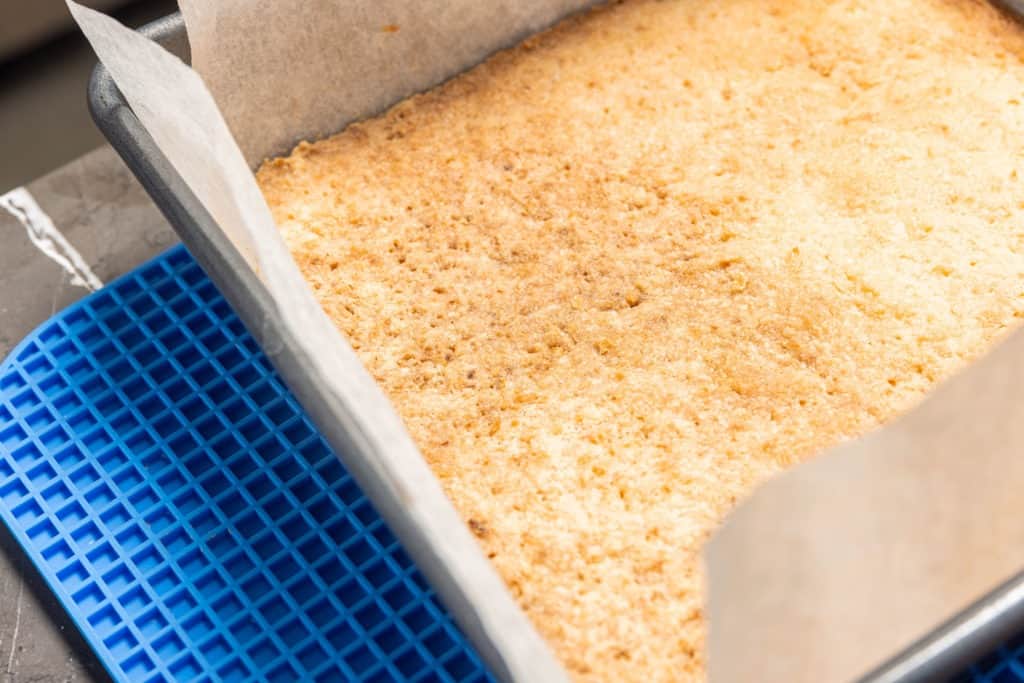 - Line an 8″ x 8″ cake pan (non-stick preferred) with parchment paper that hangs over the edges.