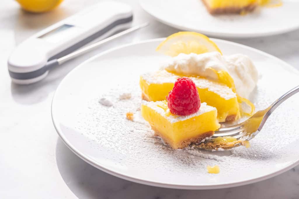 These bars are joyously lemony. They are just sweet enough, just tart enough, and aren’t cloyingly sugary. The shortbread crust is good enough to make batches of on its own, and the whole final product is like squares of perfect lemon tart. That’s the power of thermal thinking! We amped up the lemon juice and offset the required bake-time with carefully temperature-controlled custard cooking. With the accuracy of Thermapen on your side, results like this are easy!