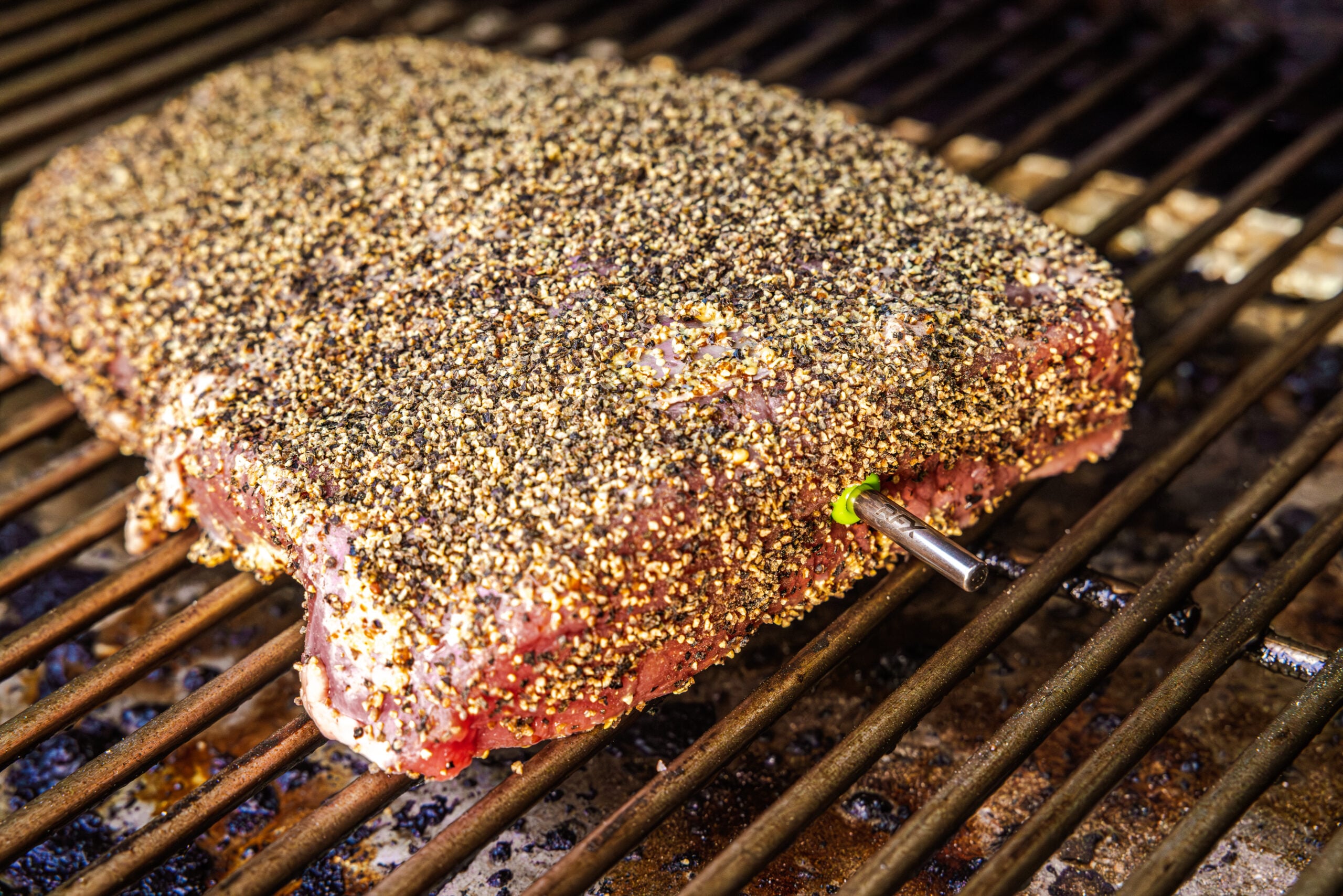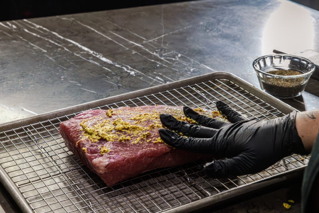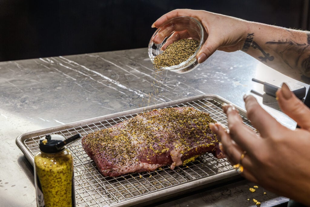 The result is a deeply savory crust that pairs perfectly with the rich, cured brisket underneath.
