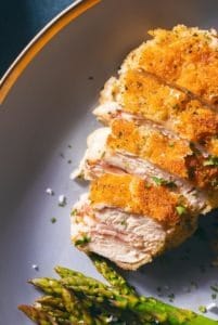 Fry the breaded, filled chicken pieces in the oil until just golden brown on each side. They will not have cooked through. Work in batches, if necessary.